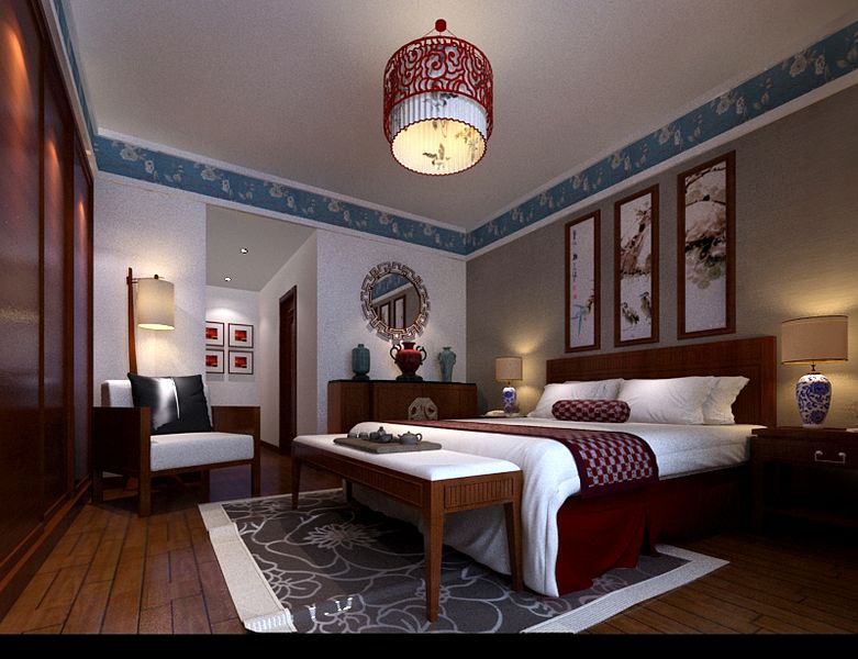 中式的字畫點綴于臥室床頭背景墻上,富有品味。