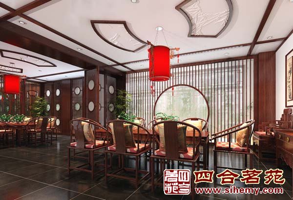 雅間二:雅間靠窗的花格可從月門出,將后面窗戶開啟。當微風輕拂,透過白沙,竹影朦朧飄渺,好像賦予了天棚上雕刻竹簡生命,回味無窮。房間整體設計,采用園林式借景為背景,意境深遠,淡定,輕松。
