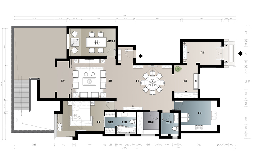 從整體布局可以看出,空間的性質追求沉穩大氣,又不乏隨性自由之感,對稱的格局,動靜分離的區域,正如空間與人的關系,融洽和諧共處。從“自在由心”的角度去認知世界并享受世界。